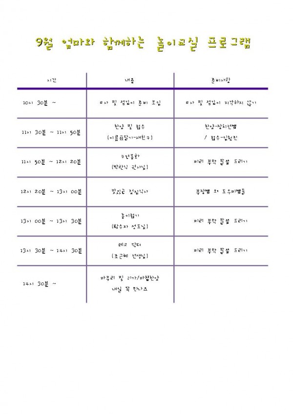 20011년 9월 엄마와 함께하는 놀이교실 프로그램 페이지 정보 작성자 박지희 작성일2011-09-21 이전글 다음글 본문 9월 24일 엄마와 함께하는 놀이교실 프로그램입니다 많은 참여 부탁드립니다 *^^* 목록 댓글목록 등록된 댓글이 없습니다.
