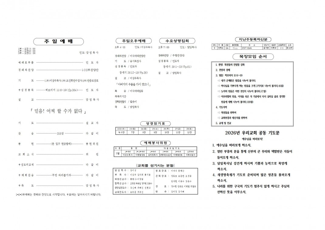 2026. 2. 22 주보 페이지 정보 작성자최고관리자 댓글 0건 조회 197회 작성일 26-02-20 20:41 본문 . 첨부파일 20260222.pdf (340.0K) 4회 다운로드 | DATE : 2026-02-20 20:41:48 목록 이전글2026. 3. 1 주보 26.02.27 다음글2026. 2. 15 주보 26.02.13 댓글목록 댓글목록 등록된 댓글이 없습니다.